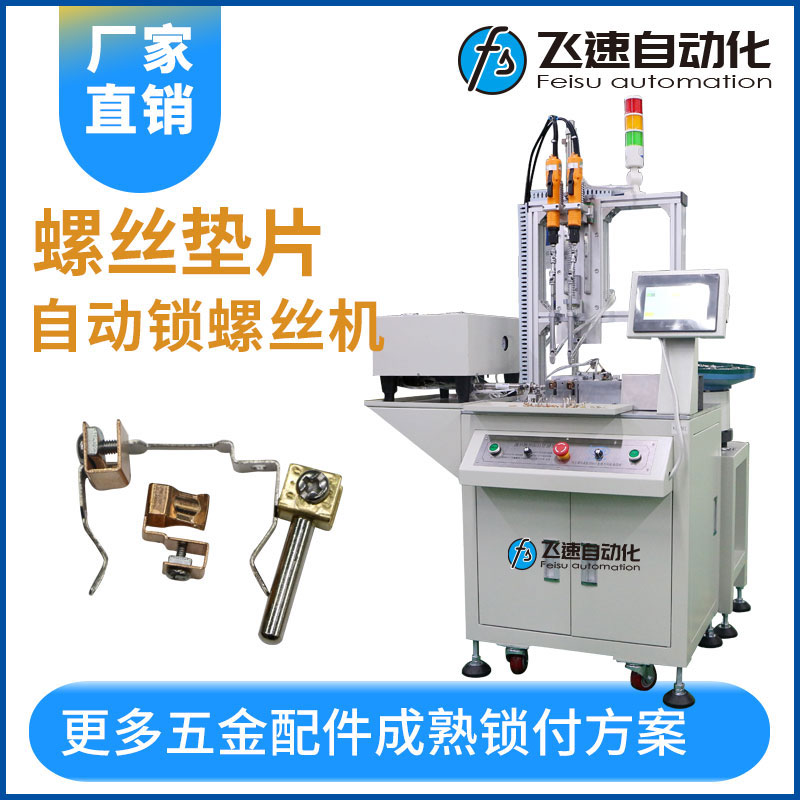 • 產品簡介: 螺絲墊片自動擰螺絲機實現將墊片套置在螺絲根部的加工目的,組合后墊片與螺絲不易松脫,組合效果好,操作十分簡單,只需一名人工輕松操作,大大降低了人工成本,實現了自動化生產,提高生產產量效果。 在緊固螺絲都會和墊片一起配合使用,人工手動把螺絲穿過墊片再擰緊,在短時間內對需求量大的穿好螺絲墊片無法達到效果,裝配螺絲墊片的方式就會降低了效率,無法滿足生產商的需求。 所以為了克服螺絲墊片人工手動裝配效率低,成本高的缺陷,廠家往往會考慮到生產效率,成本以及產品質量等因素會選擇一款自動化組裝螺絲墊片的自動擰螺絲機器。