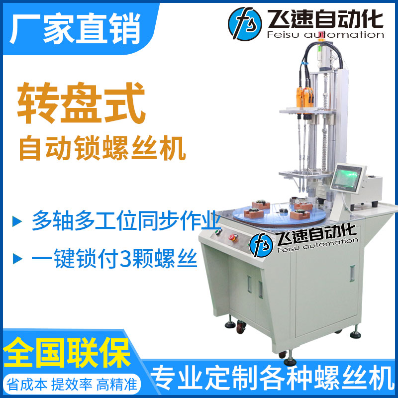 轉盤式鎖螺絲機又分為普通轉盤式、轉盤機械手式、自動出料式、雙鎖付系統等多種機型,滿足不同生產線及產品擰螺絲要求。