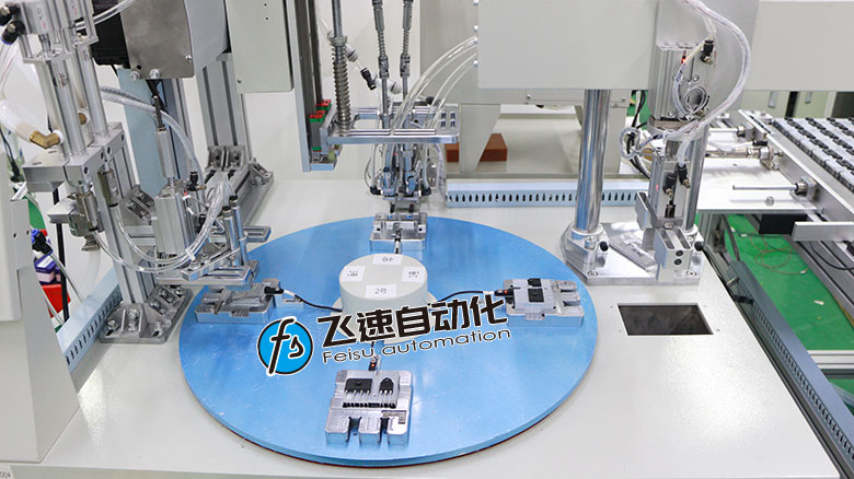 本案例采用2軸轉(zhuǎn)盤(pán)機(jī)械手帶點(diǎn)膠自動(dòng)鎖螺絲機(jī),第一工位人工將散熱器和三極管放到夾具,第二工位點(diǎn)膠,第三工位吸三極管鎖螺絲,第四工位機(jī)械手取出到輸送帶上。鎖螺絲的位置根據(jù)不同規(guī)格散熱器螺絲孔位可調(diào)。