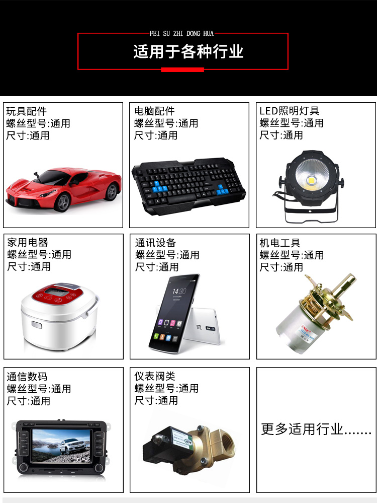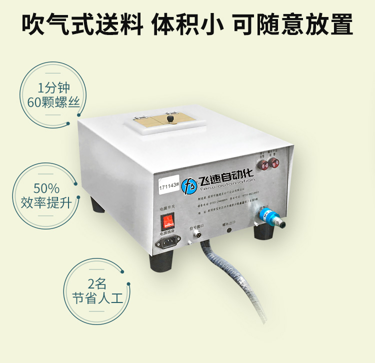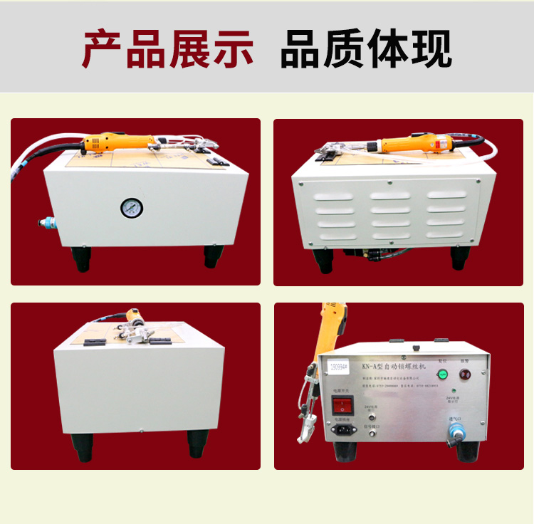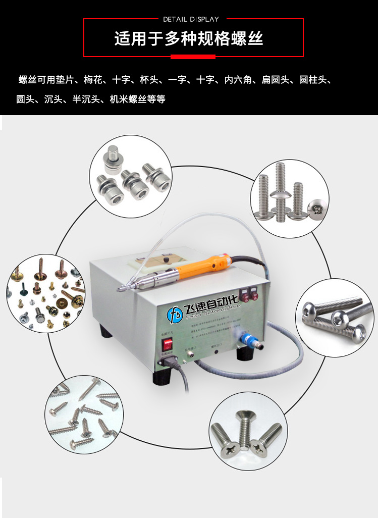• 產品簡介: 手持式自動打螺絲機也叫自動供料鎖螺絲機、自動擰螺絲機等,嚴格來講,手持式只能算是半自動,因為它還是需要手工操作。一臺手持式自動鎖螺絲機主要由兩部分組成:自動供料機和電批,其中自動供料機是重要的,也是復雜的,它的好壞直接關系到機器卡不卡料的問題。1.采用渦輪上料,體積和噪音小、重量輕,可存放在工作平臺上,節省空間; 飛速手持式螺絲機: 1.螺絲自動排列、供料,自動篩選異型螺絲,自動補給空料,無料會自動報警; 2.送料采用感應器控制,鎖付完一顆來一顆,自動送料,不會出現重復給料現象; 3.滑牙不送料:在鎖付工程中,扭力達不到,螺絲不送出,防止批嘴出現卡料現象; 4.穩定性好,不卡料,即使不良導致卡料,非專業人員也可以在幾秒鐘內解決卡料; 5.效率高,一般1秒鐘打一個螺絲,不用抓起螺絲,只需對準螺絲孔位鎖緊螺絲即可; 6.可減少1到2個工人螺絲鎖付作業,實現半自動化生產,降低工人的勞動強度,提高生產率; 7.關鍵部位采用高品質五金材料并經過特殊處理,電子原器件采用原裝進口,確保設備零故障。 產品適用范圍 1.適用于各種類型的螺絲,螺絲總長應大于1.3倍螺帽直徑; 2.支持深孔螺絲鎖付,孔深小于40mm,M1-M6的螺絲; 3.適用于數碼、電子、小家電、電源開關、燈具、LED、玩具等產品。