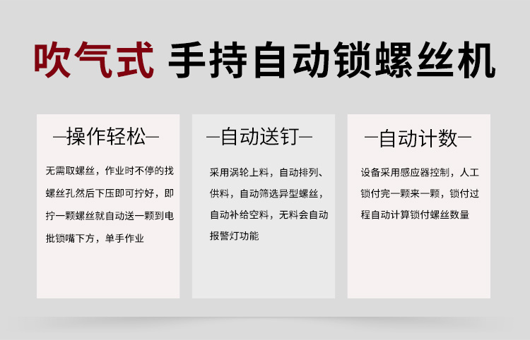 當前位置:當前位置: 首頁 ? 產品中心 ? 飛速手持式自動鎖螺絲機,智能款,每次只送一顆螺絲,不卡料